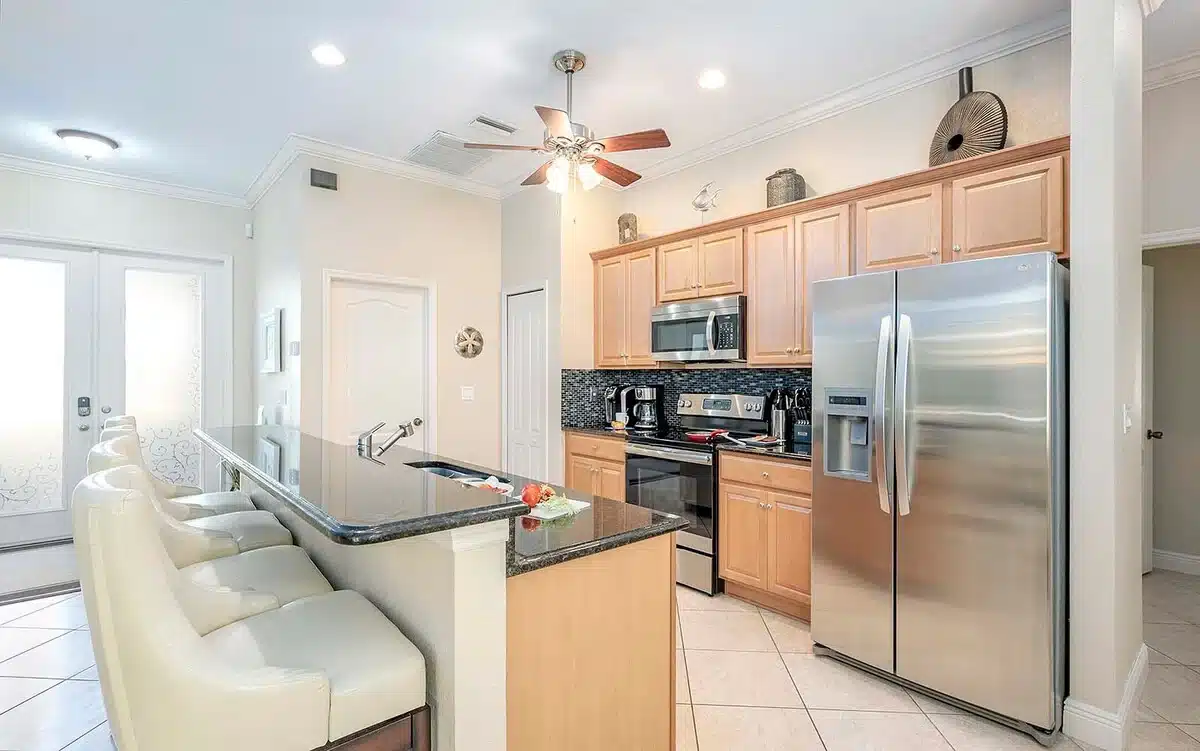 Fully equipped kitchen with its spacious island there is sufficient space to make great family memories and not feel separated from your loved ones.