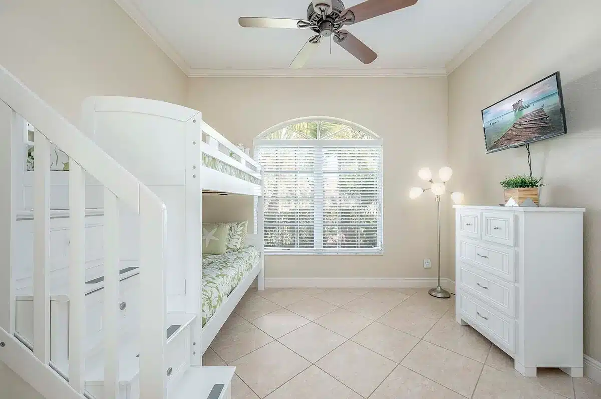 The four bedrooms are fitting for a larger group or multiple families with two queen size bedrooms, one main king bedroom and one bedroom featuring a bunk bed.